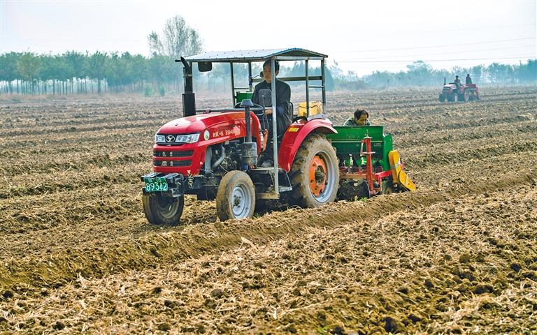 10月30日,在渭南市富平县流曲镇官路村田地里,村民驾驶谷物播种机播种冬小麦。记者 袁景智摄