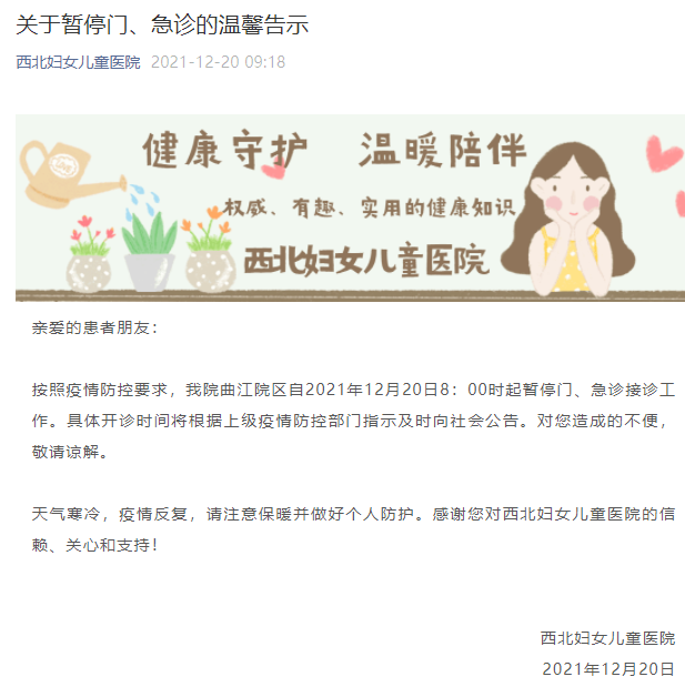 据西北妇女儿童医院官方微信消息,按照疫情防控要求,西北妇女儿童医院曲江院区自2021年12月20日8:00时起暂停门、急诊接诊工作。