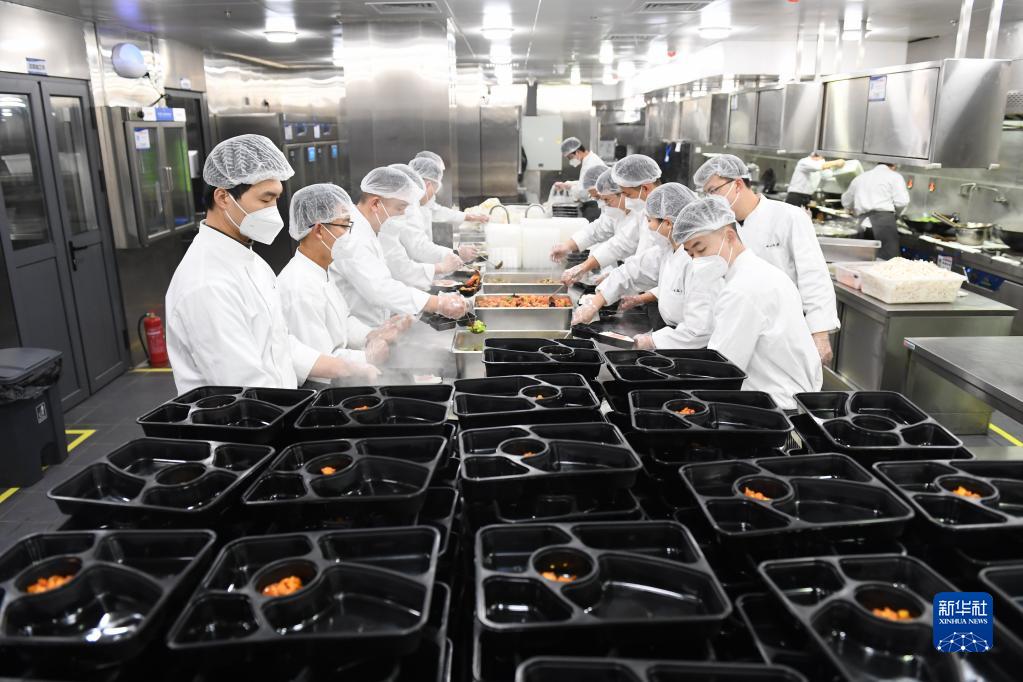 1月13日,在西安市西安饭庄东大街总店,后厨人员打包团餐。