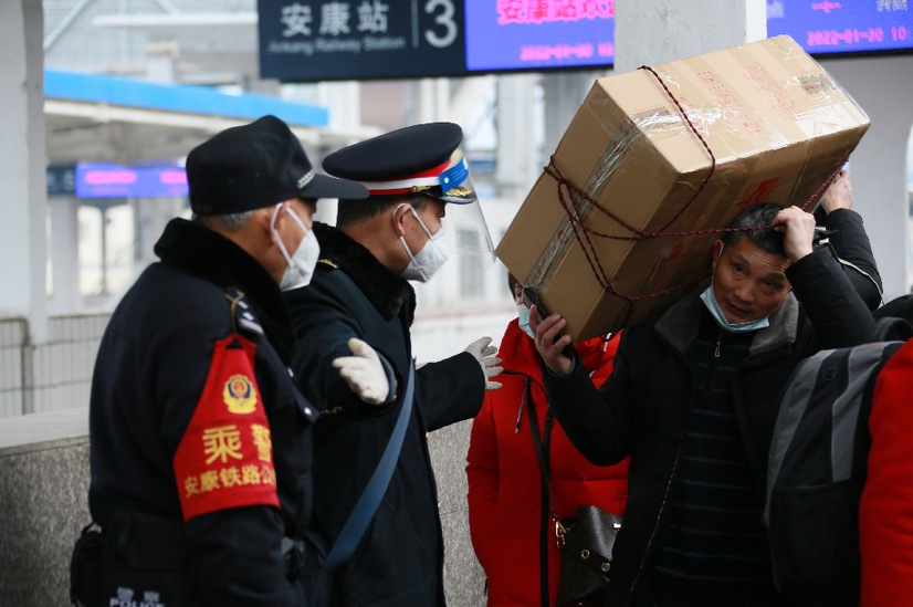 2022年1月30日6065次列车安康站始发前,列车长王振华和乘警赵福兴在站台上组织旅客乘车