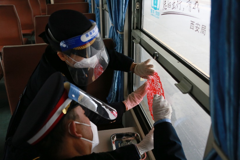 2022年1月30日新年将至,列车长王振华和同事在6065次列车上贴窗花