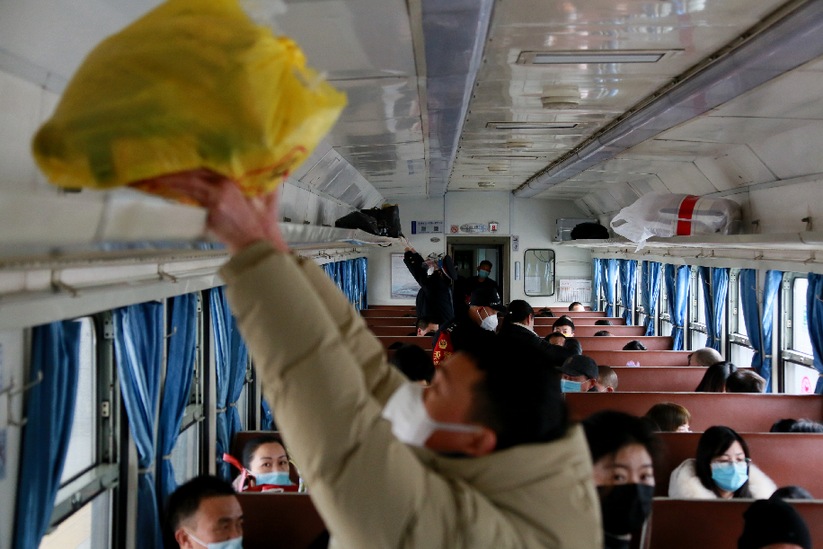 2022年1月30日6065次列车上客运员检查行李架物品安全