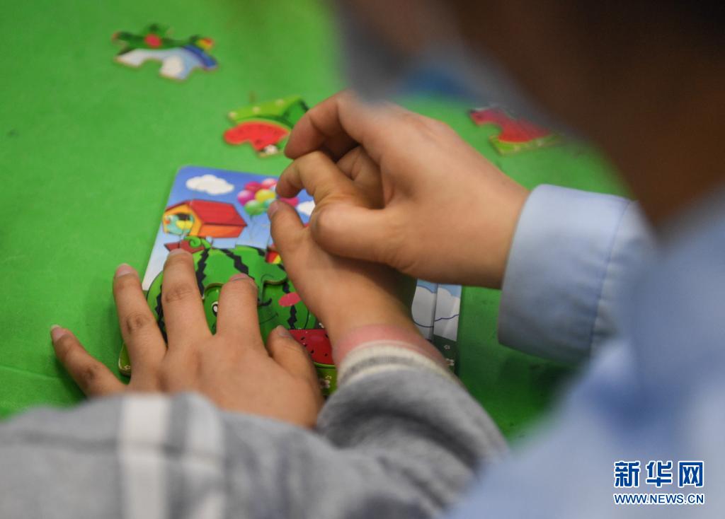 3月30日,在西安市金色阳光康复中心,特教老师指导孩子练习拼图。