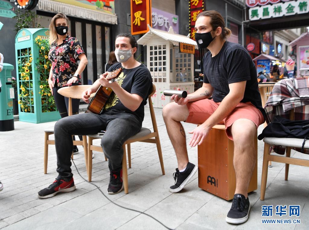 2020年4月16日,一支来自巴西的乐队在西安市未央区一处商业街区进行户外表演。