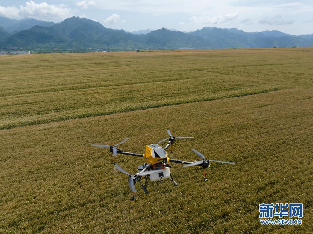 长丰农机专业合作社的农机手在雨歇期间,操作植保无人机,在麦田内喷洒抗麦穗发芽药剂,应对连阴雨对收获造成的不利影响(5月30日摄,无人机照片)。 新华社记者 邵瑞 摄