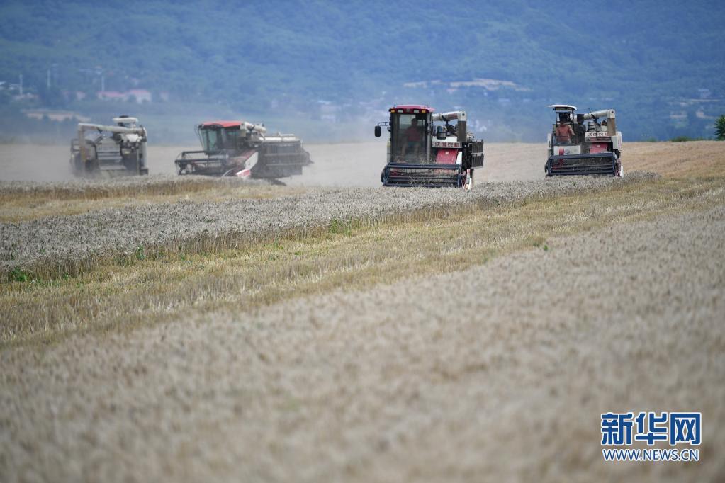 6月8日,长丰农机专业合作社社员驾驶收割机在西安市长安区神禾塬万亩优质粮食生产基地内抢收小麦。新华社记者 邵瑞 摄