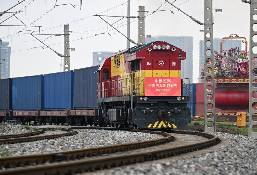 4月23日,中欧班列长安号吉利汽车出口专列从西安国际港站驶出。新华社记者 李一博 摄