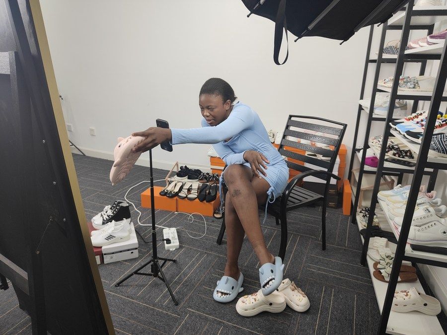 “我有一些技巧,知道如何与人交流和沟通,让他们持续观看我的直播,”阿什莉说,“我们现在花更多精力推销女鞋,还销售运动鞋、凉鞋等不同种类的鞋子。我的客户绝大多数来自英国,理想情况下,我这儿每天能售出20多双鞋。”