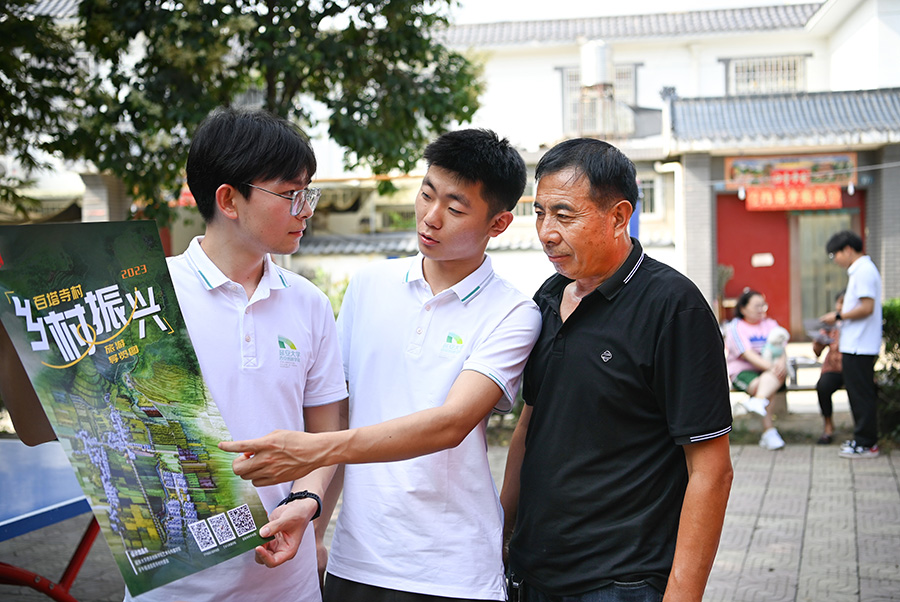 6月29日,延安大学西安创新学院艺术与传媒学院学生(左一、 二)向百塔寺村村民介绍手绘旅游导览图。