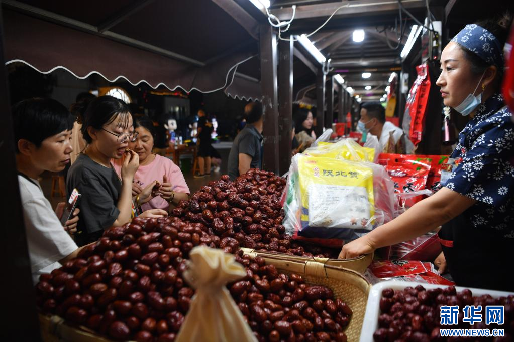 6月28日,游客在延安市延州二道街夜市选购陕北特产。