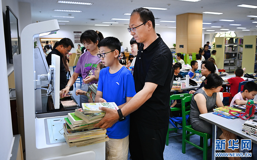 7月2日,家长陪伴孩子在陕西省图书馆少儿阅览室自助还书箱前归还图书。