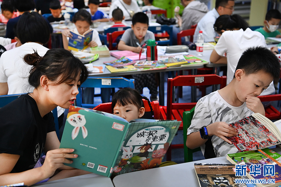 7月2日,一位母亲在陕西省图书馆少儿阅览室辅导孩子阅读。