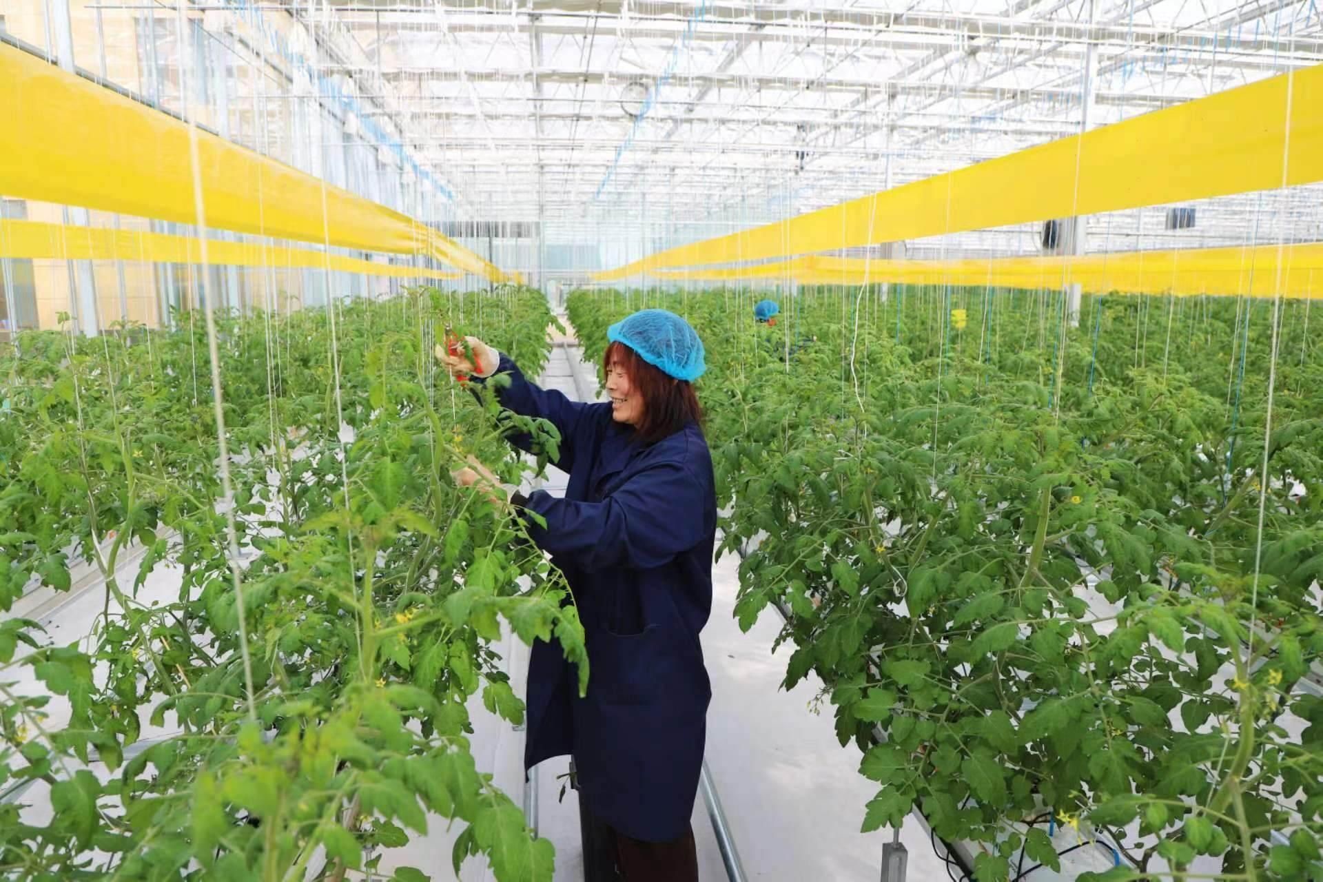 智能温室大棚里,一串串晶莹剔透的红色小番茄层层叠叠挂在枝蔓上。“每年四月下旬开始采收,采摘周期约为8-9个月,日产量大约500公斤,每年总产值达到300万元以上。”企业负责人介绍。