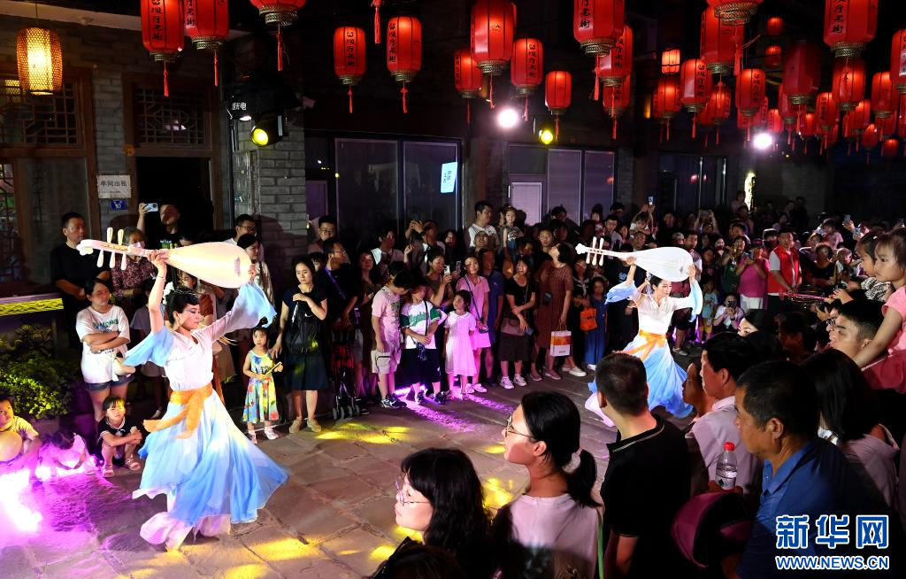 游客在陕西省汉中市留坝县老街上观赏文艺演出(7月22日摄)。
