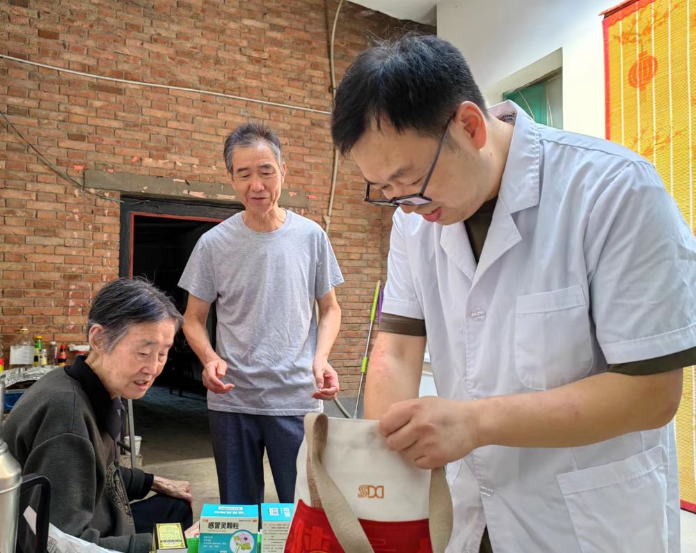 王磊正在给杨学孟老人的遗孀(左一)赠送药品。新华记者 孙正好 摄
