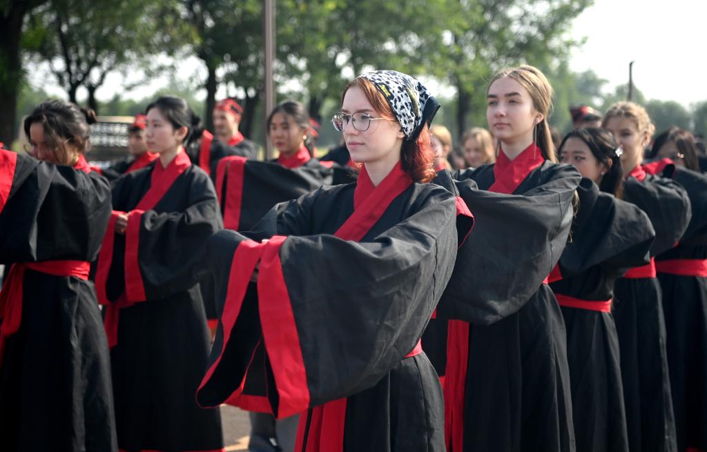 9月16日,中外大学生身着汉代服饰感受中国传统文化。新华社记者 刘潇 摄