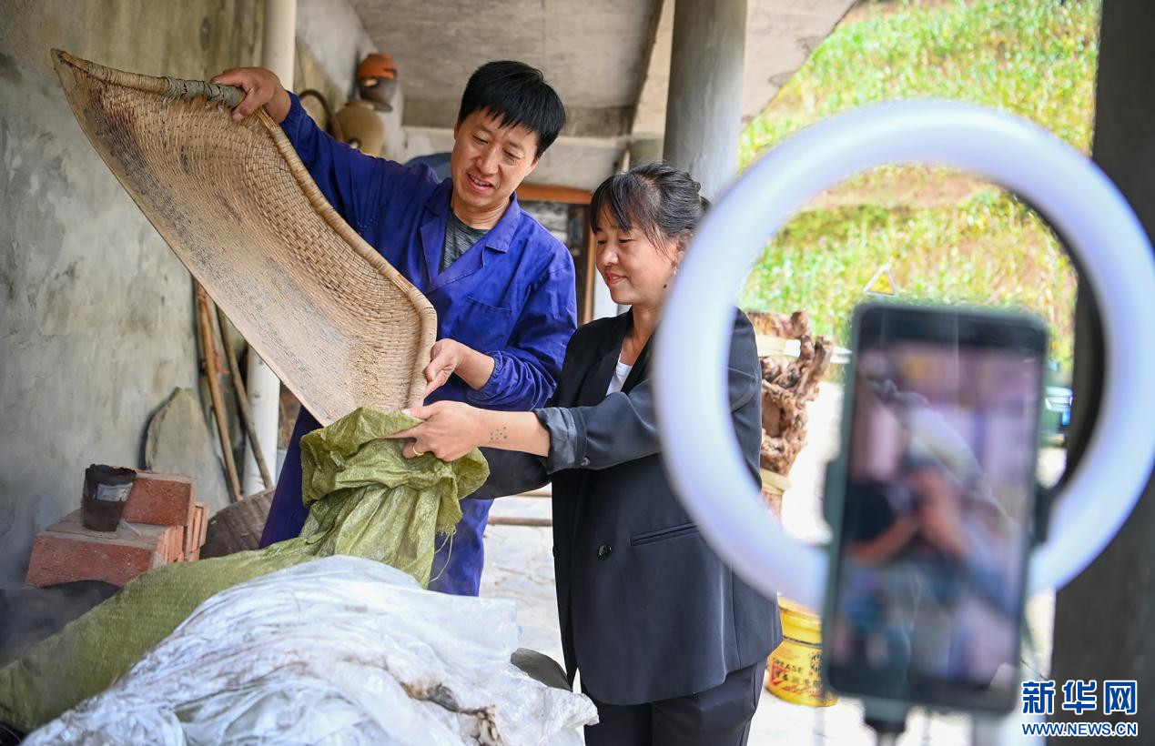 陈道成与妻子一边蒸漆籽面,一边现场视频向网友直播土法榨油过程(9月12日摄)。pagebreak