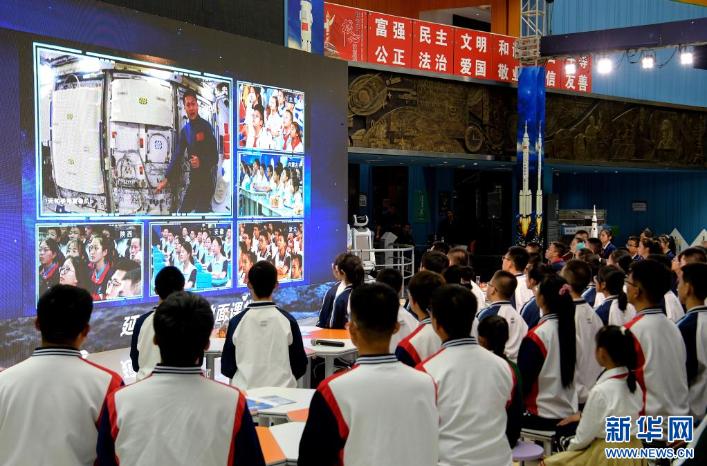 9月21日,在陕西延安科技馆“天宫课堂”第四课地面课堂,学生在向航天员提问。