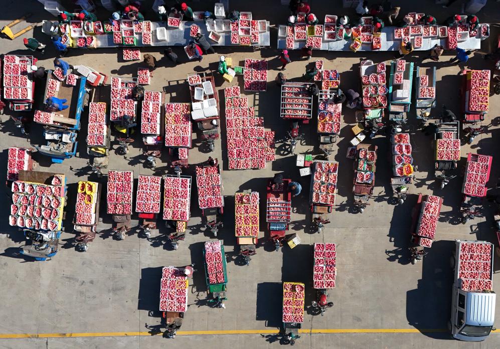 10月20日,果农在延安市洛川县一家果业企业售卖苹果(无人机照片)。新华社记者 邹竞一 摄