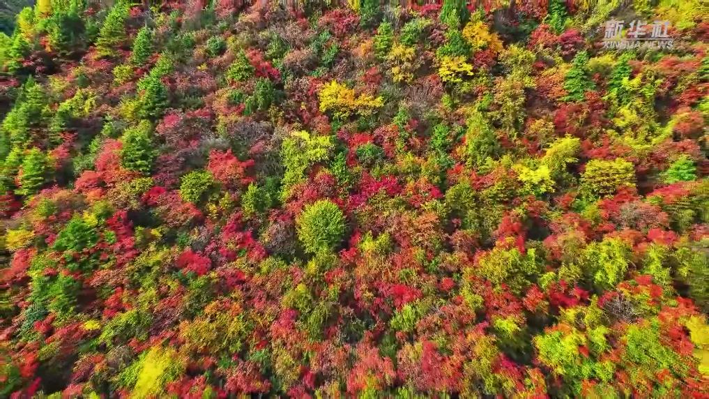 深秋时节,横贯中国腹地的秦岭山脉五彩斑斓,漫山遍野的红叶和山顶白雪相映,勾勒出一幅色彩丰富的美丽画卷。