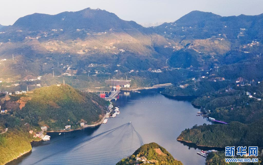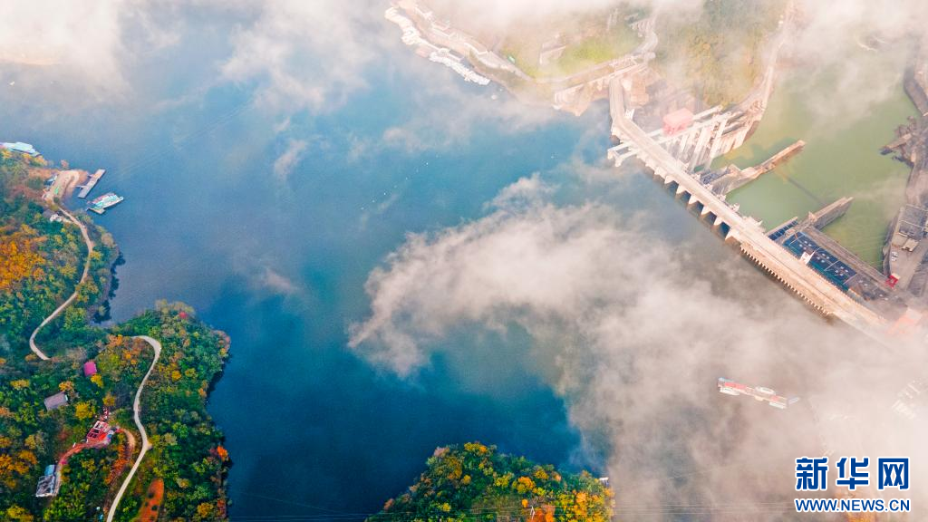 这是11月1日无人机拍摄的安康汉江水电站大坝和瀛湖风景区码头。赵华斌 摄