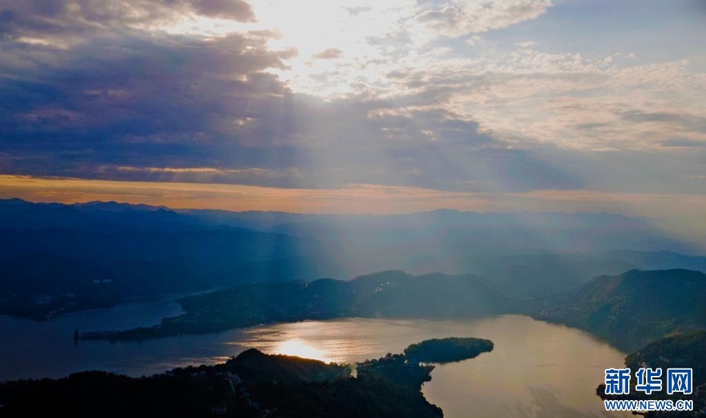 这是10月31日无人机拍摄的霞光打在汉江安康瀛湖江面形成的山水画色。赵华斌 摄