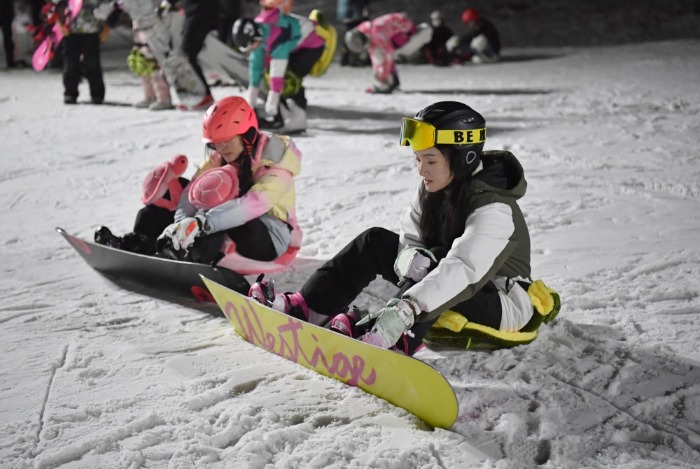 滑雪爱好者在鳌山滑雪场夜场中穿戴雪板。新华社记者邵瑞摄