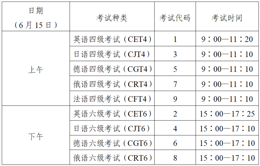 英语四级口语考试(CET-SET4)考试时间为5月18日(F241次),英语六级口语考试(CET-SET6)考试时间为5月19日(S242次),具体场次安排如下: