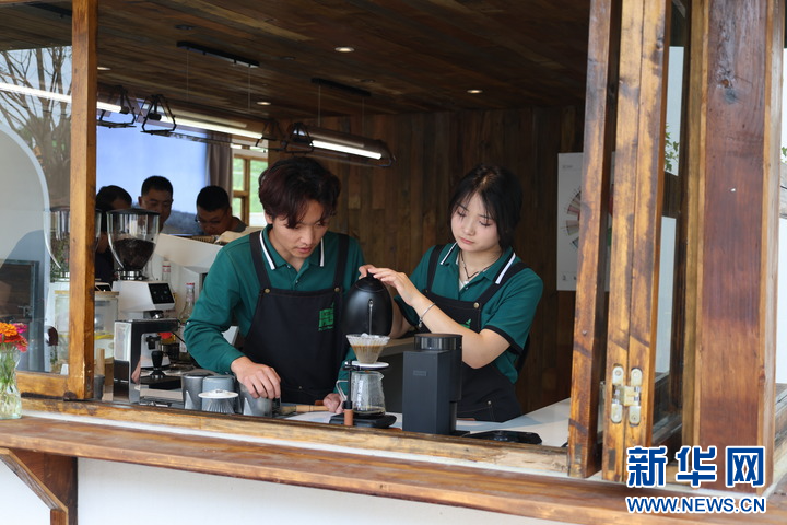 5月31日,西安市蓝田县前卫镇将军村咖啡馆的工作人员正在冲制咖啡。新华社记者 林胜概 摄