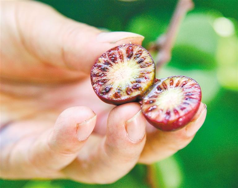时间到了2012年,张莹和他的团队在解决了新品种从高山到平原的引种成活问题后,开始不断对具有水果潜力的资源进行发掘。历经3年,紫色猕猴桃“2.0”升级版“仙紫光”孕育成功。这种果子较“秦紫1号”个头稍大一些,单果重量能达到14克,果肉颜色更深,呈黑紫色。“虽然这一代的果子品相和营养成分都有所提升,可溶性固形物,也就是判断水果品质好坏的指标还未达到商品果的最高标准,后续提升的空间还很大。”张莹说。