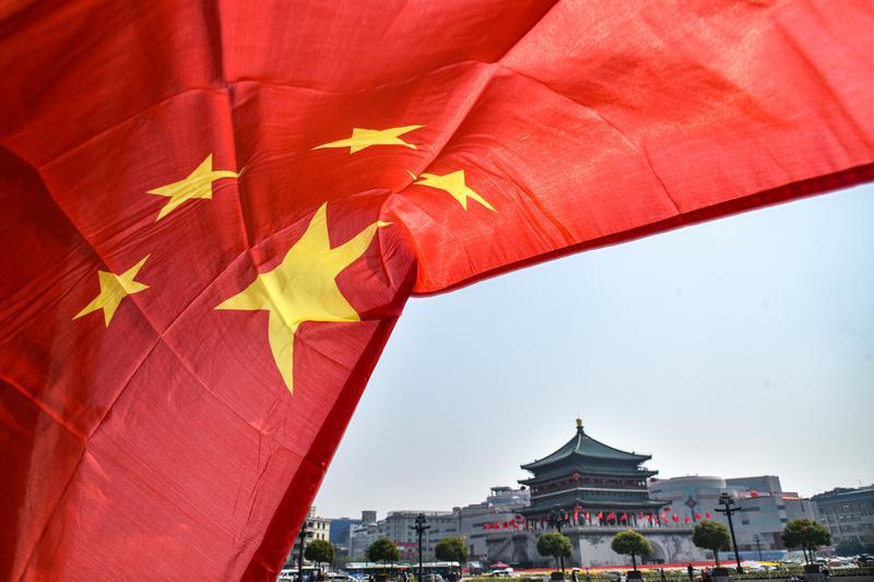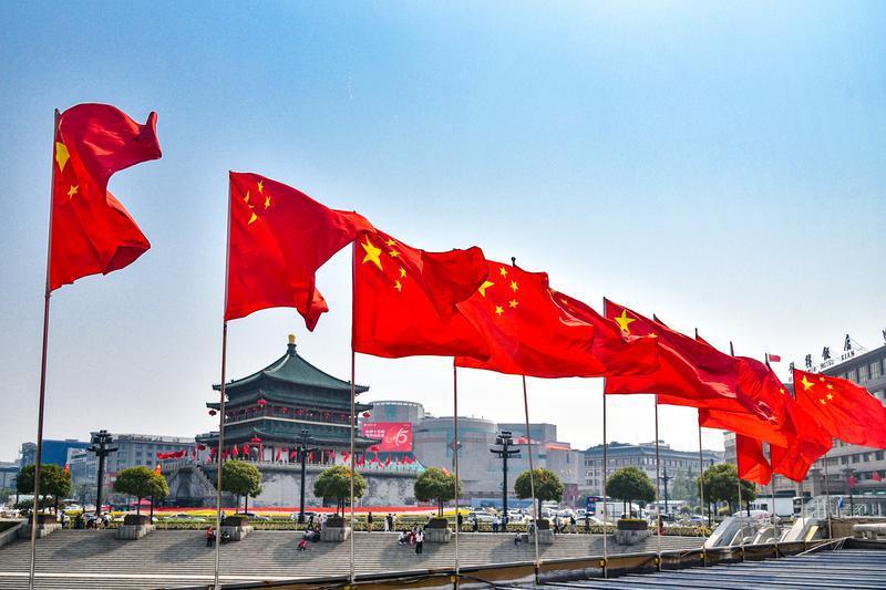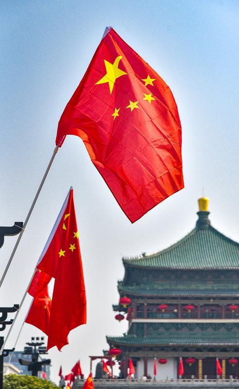 9月27日,国庆节即将来临,西安钟楼和周边街道上一面面国旗迎风招展,营造出喜庆热烈的节日氛围。(西安报业全媒体记者 王健 摄)
