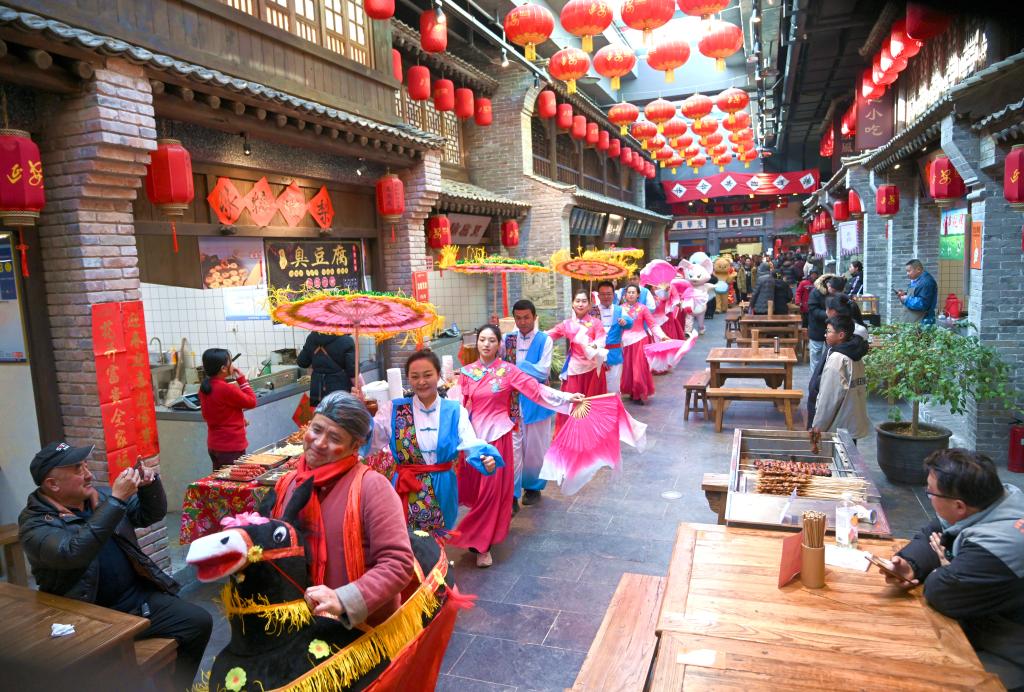 除夕以来,来自枣园街道办的十余支秧歌队在延安1938相继亮相、轮番展演。陕文投集团延安公司自发组建的秧歌队参与其中,已开展巡游70余次。此外,来自延安市以及宝塔区的文化惠民演出团队已在延安1938表演超30余场,为游客带来了难忘的文化体验。秧歌展演将持续到正月十五。(刘景隆)