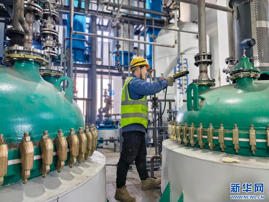 2025年2月27日,在位于陕西咸阳(彬州)高端能源化工园区内的一间厂房内,工作人员在检查运行设备(手机照片)。新华社发