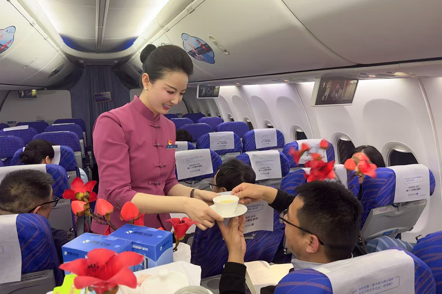 当日,客舱内精心布置着春分主题装饰,甫入客舱便仿佛走进了一座“空中花园”,浓郁的春天气息瞬间将人包围。活动期间,乘务员化身空中茶艺师,为旅客沏上清香绿茶,在万米高空共同品味春茶的独特芬芳。航班还特别准备了陕西特色小吃——绿豆糕,细腻清甜的口感,宛如春日花朵带来的甜蜜。最后,乘务员为旅客介绍南航绿色飞行预订流程并开展“低碳出行 绿色飞行”知识问答,向广大旅客传递绿色环保理念。
