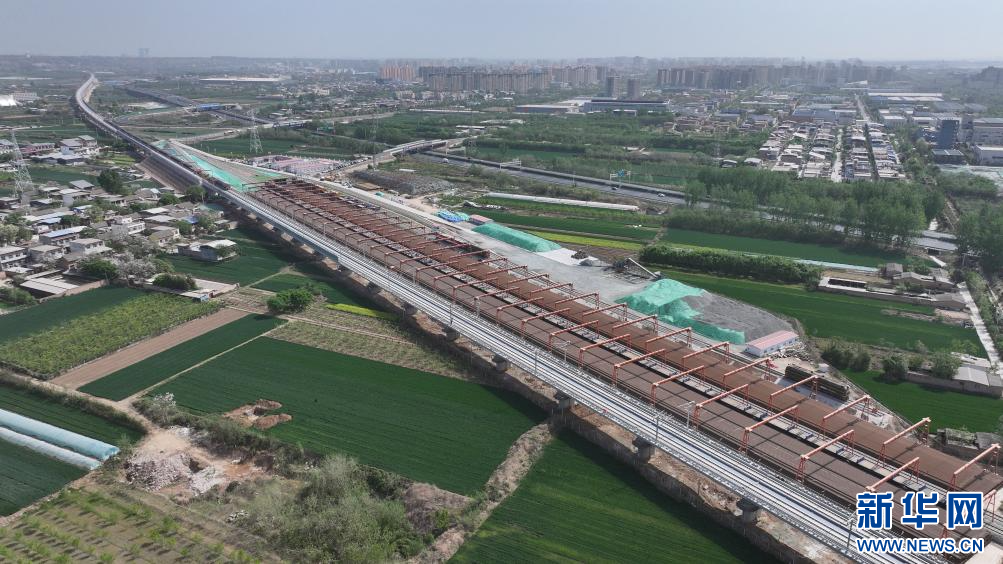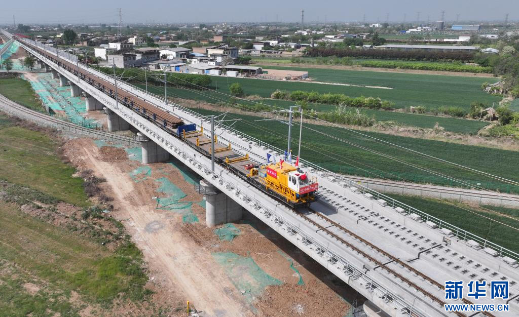 4月18日,铺轨设备在西延高铁西安阎良段进行铺轨作业(无人机照片)。