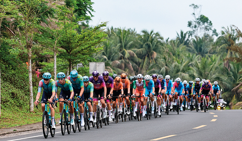 参赛车手在2025第十六届环海南岛国际公路自行车赛比赛中(2025年4月7日摄)杨冠宇摄/本刊