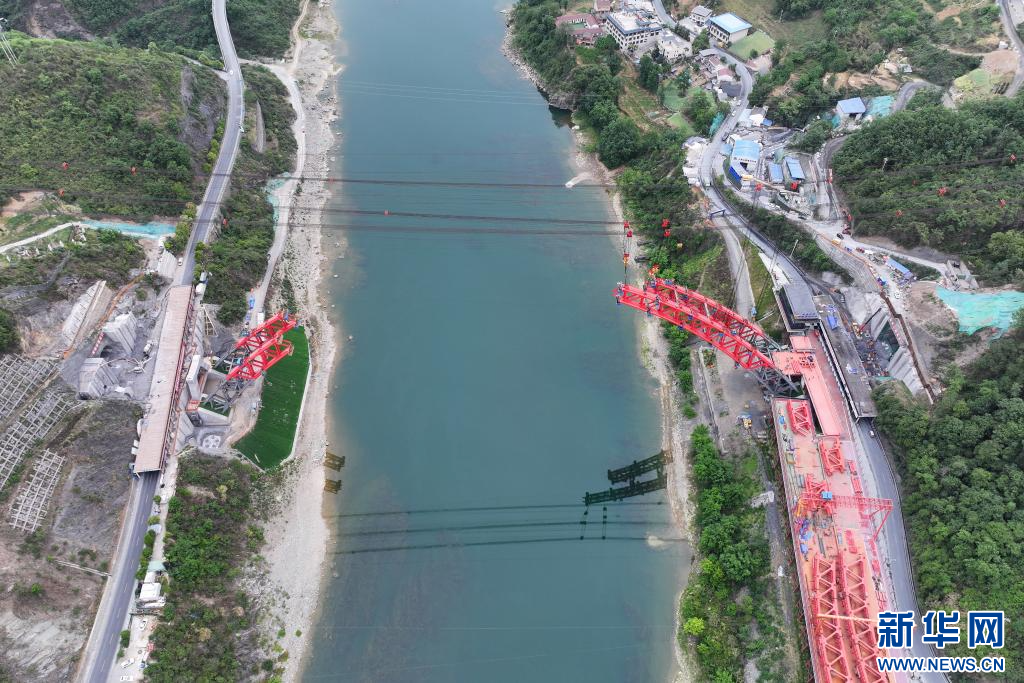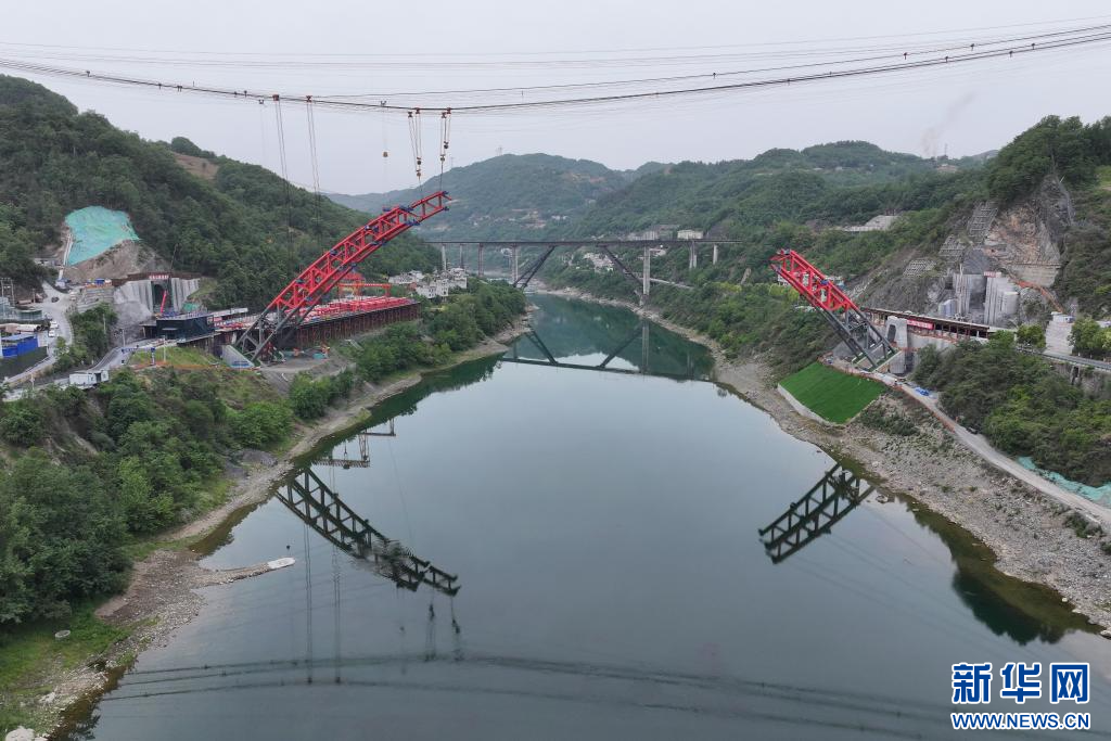 4月29日拍摄的西渝高铁安康汉江大桥钢拱安装建设现场(无人机照片)。