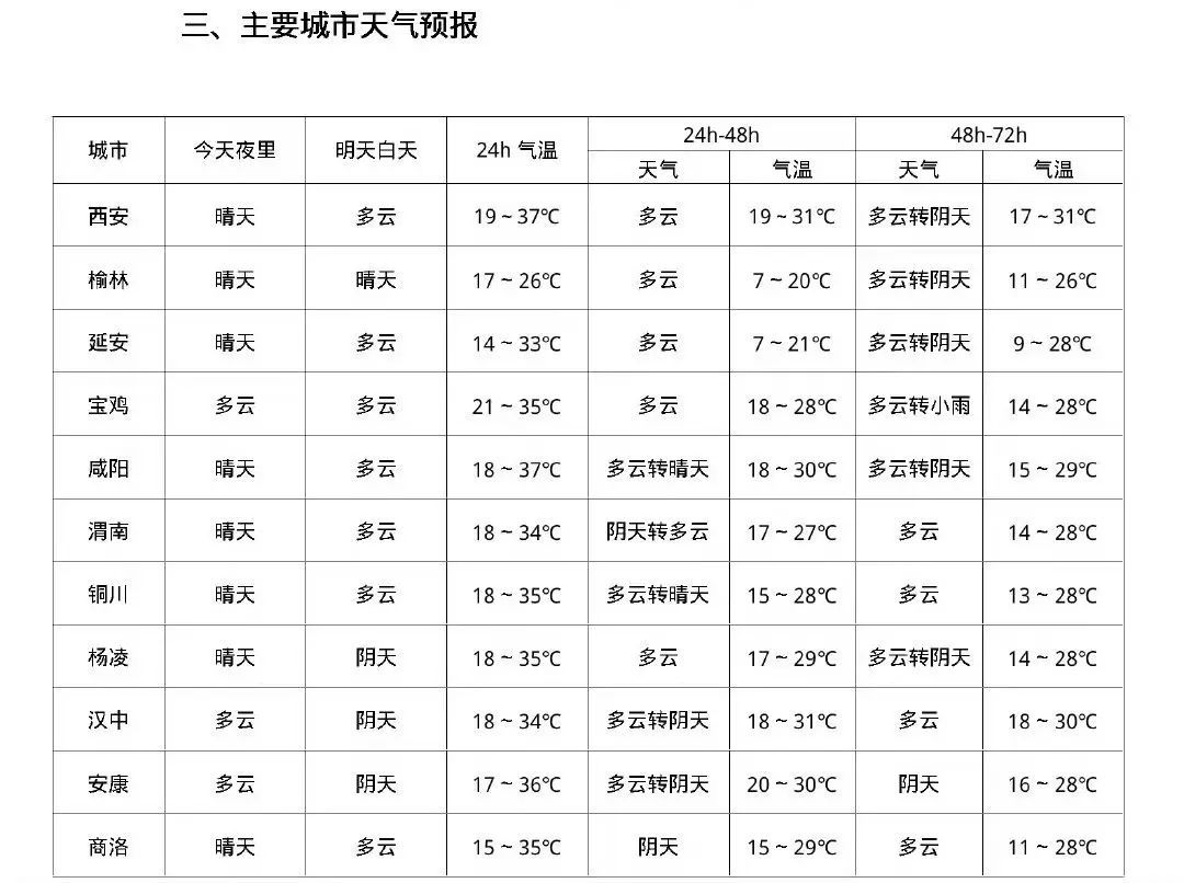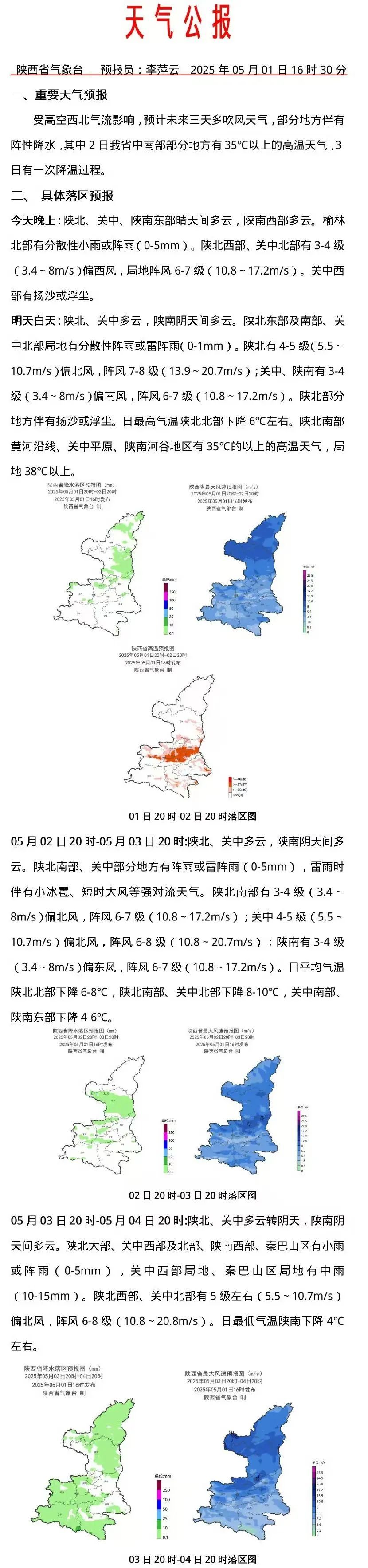 受高空西北气流影响,预计未来三天多吹风天气,部分地方伴有阵性降水,其中2日陕西省中南部部分地方有35℃以上的高温天气,3日有一次降温过程。