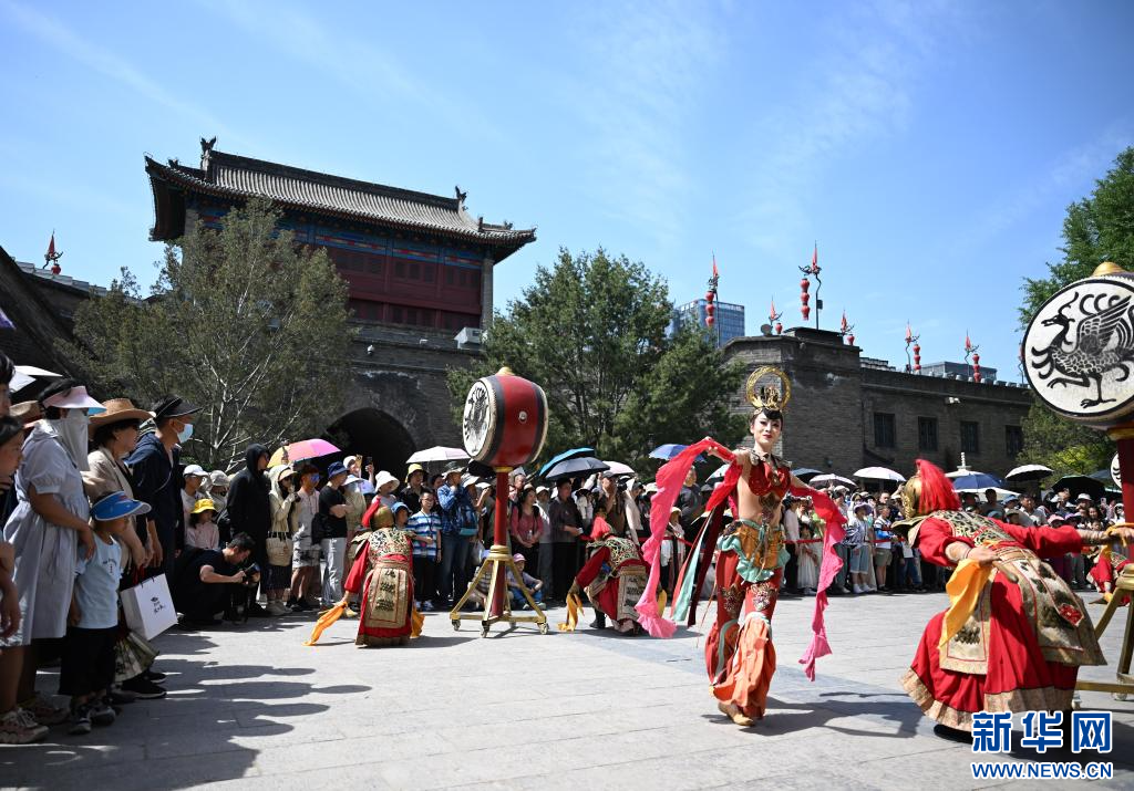 5月2日,游客在西安城墙永宁门瓮城观看演出。
