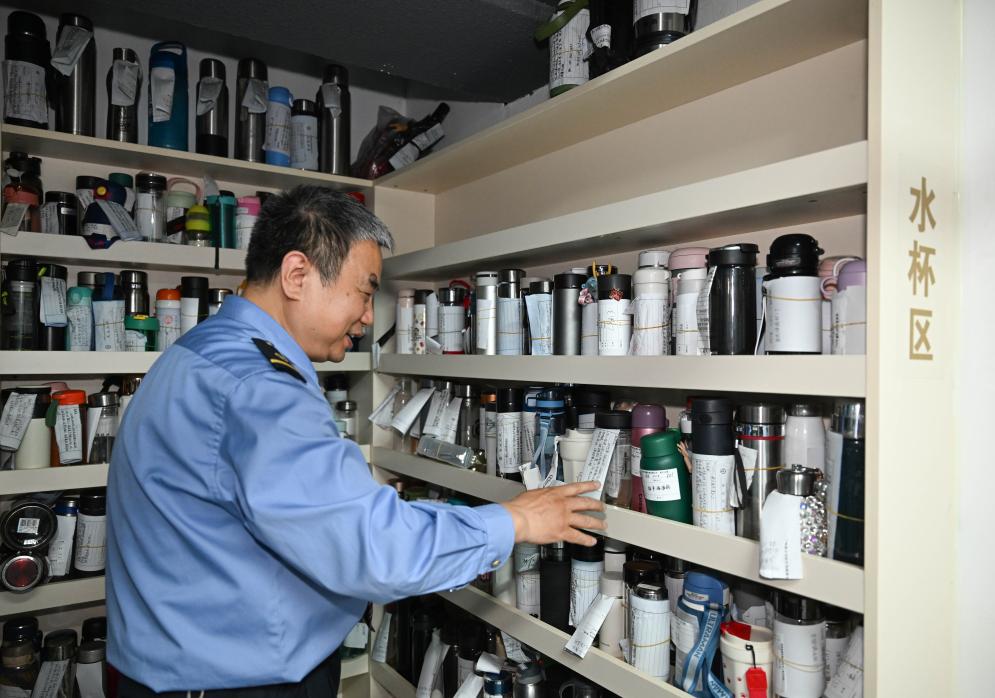 5月2日,在西安站遗失物品招领处库管区,谭仲元整理旅客遗失的水杯。新华社记者 张博文 摄