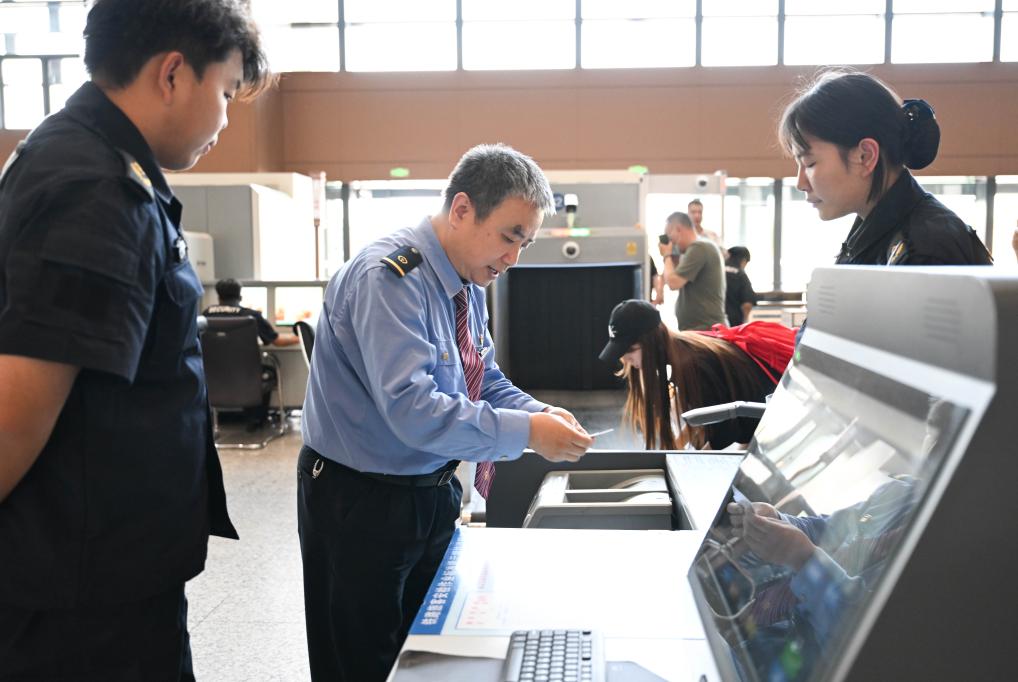 5月2日,谭仲元(中)在西安站进站安检口交接旅客遗失的证件。新华社记者 张博文 摄