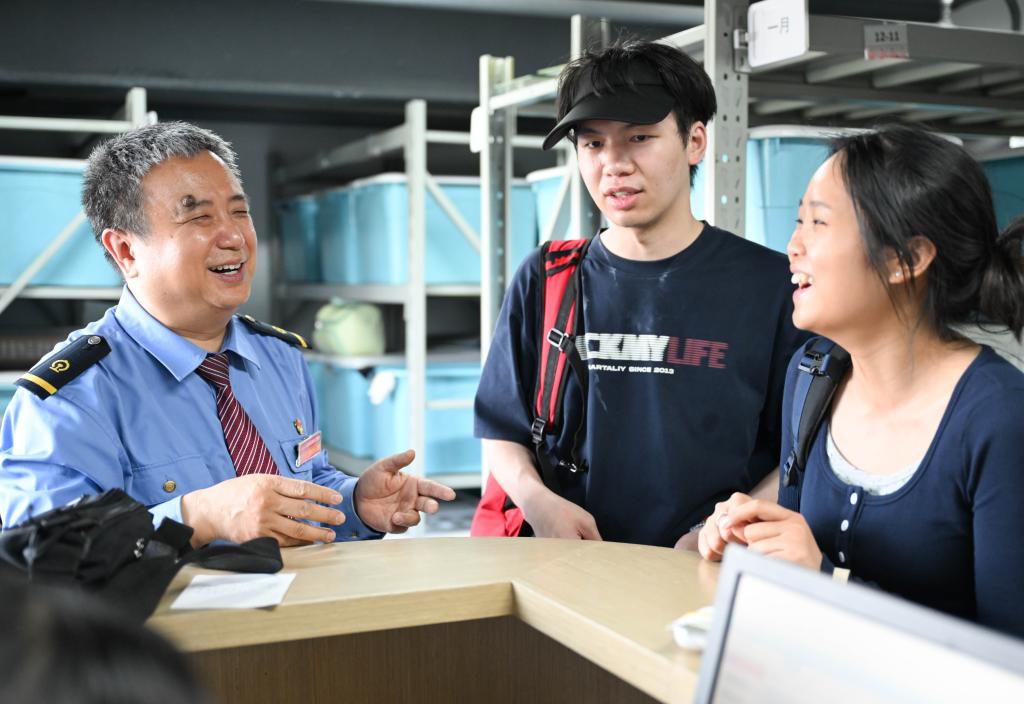 5月2日,在西安站遗失物品招领处库管区,两名前来领取遗失物品的旅客与谭仲元(左)交流。新华社记者 张博文 摄