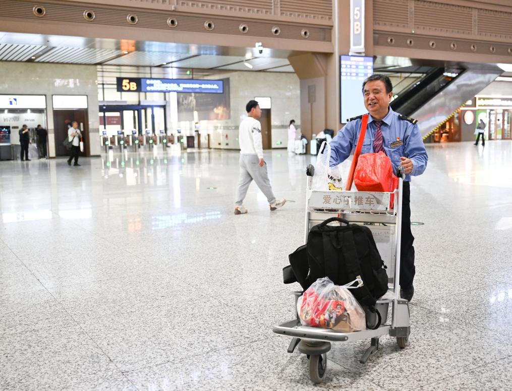 5月2日,谭仲元使用行李车运输旅客遗失物品。新华社记者 张博文 摄