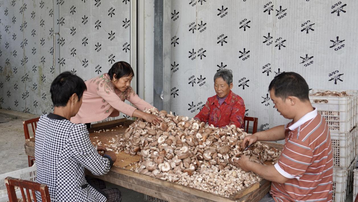 宁陕县城关镇青龙娅村村民正在分拣新鲜香菇。