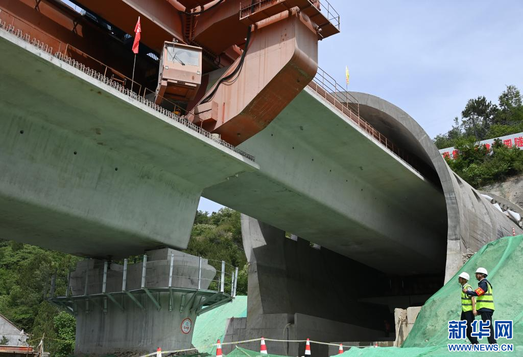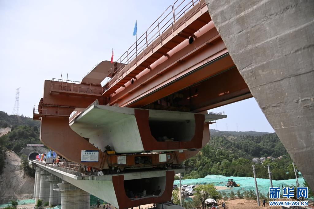 5月18日,施工人员在龙凤坡大桥上架设西十高铁全线最后一孔箱梁。