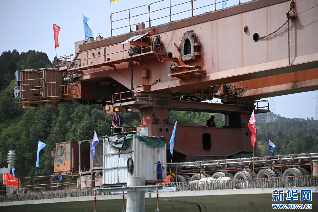 5月18日,施工人员操作设备在龙凤坡大桥上架设西十高铁全线最后一孔箱梁。