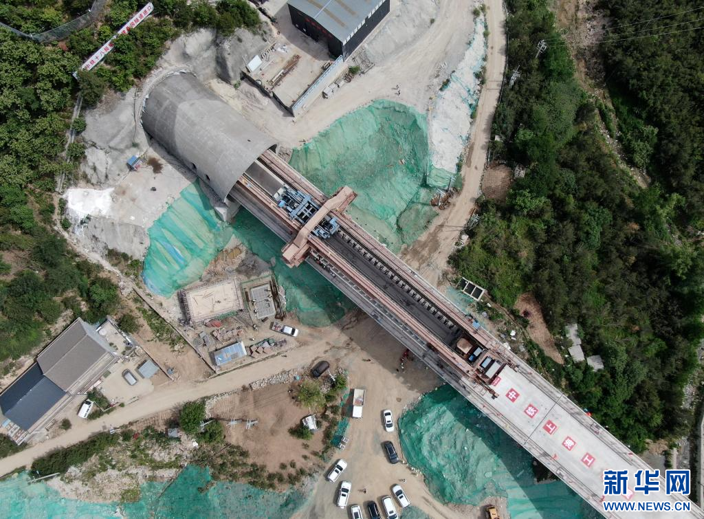 5月18日,施工人员在龙凤坡大桥上架设西十高铁全线最后一孔箱梁(无人机照片)。