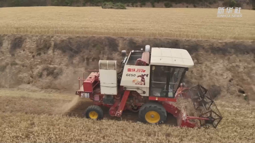 在宝鸡市凤翔区长青镇,田野里的小麦颗粒饱满、长势喜人,联合收割机正在麦田中来回穿梭,一派繁忙景象。