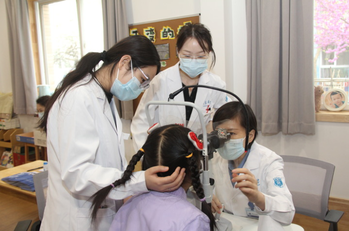 图为空军军医大学西京医院眼科主任医师窦国睿(右一)在幼儿园为小朋友进行眼部检查。新华社发