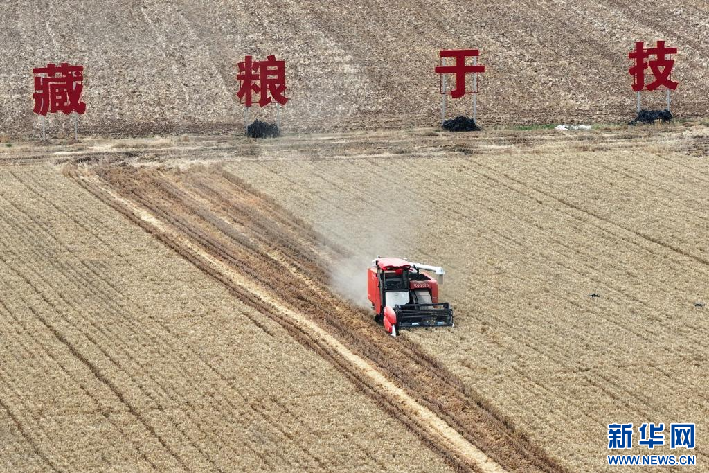 图为收割机在神禾塬万亩优质粮食生产基地作业(无人机照片)。新华社记者邵瑞 摄